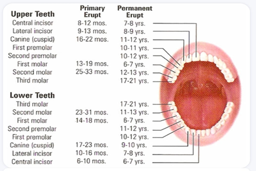 Ø છ વર્ષની ઉંમરથી દાંત પડવાની શરૂઆત થતી હોય છે જે 13 થી 14 વર્ષની ઉંમર સુધીમાં બધા કાયમી દાંત આવી જતા હોય છે ડહાપણ દાઢ 17 થી 21 સુધીમાં આવી જાય છે