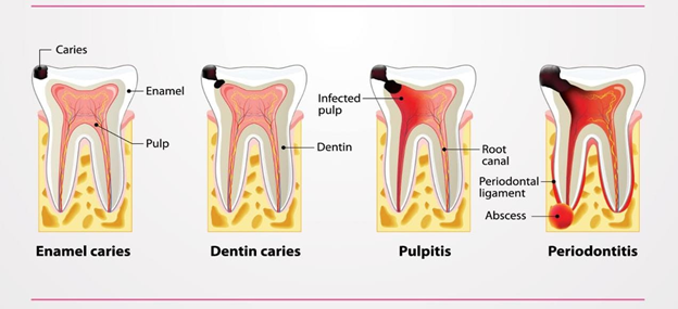 · This acid production - mostly due to excessive consumption of chocolates, sweet and sugary food, sticky in nature which remains on tooth surface for long and combines with the bad bacteria present in saliva to produce acid.